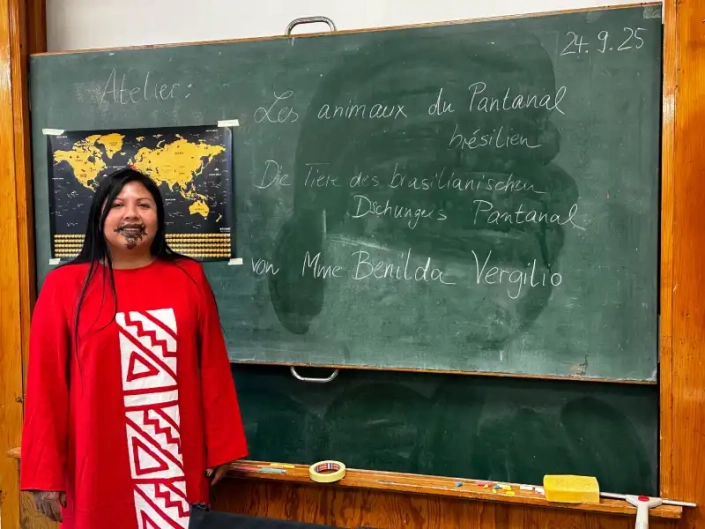 Benilda est une personnalité aux multiples facettes qui met en avant son identité autochtone afin de préserver sa culture et de représenter les femmes autochtones dans les sphères publiques et politiques. C’est ainsi qu’elle est venue passer un après-midi dans notre école, vêtue d’une robe qu’elle avait elle-même conçue et arborant le maquillage tribal typique de motifs géométriques abstraits autour de la bouche, pour animer un atelier de peinture sur le thème « Les animaux de la jungle brésilienne du Pantanal ».